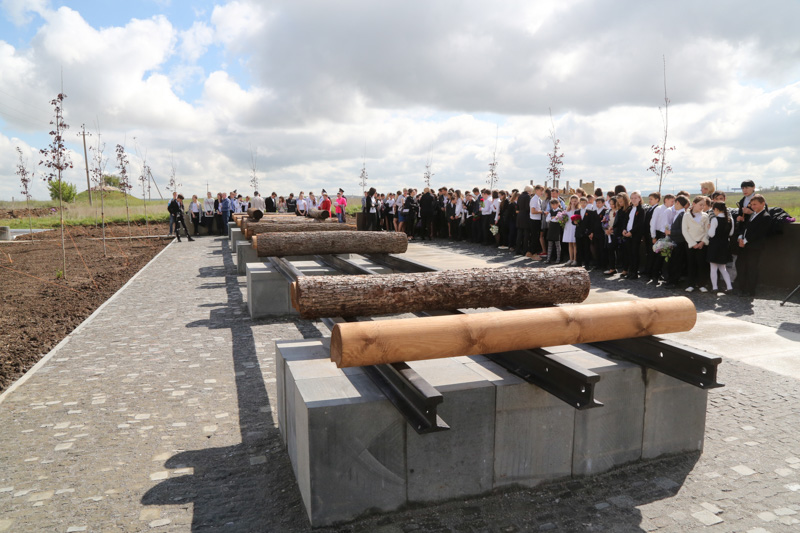 «Сквер памяти» расположен на месте сожжения узников концлагеря «Красный» - его площадка засыпана черным щебнем, символизируя выжженную землю и пепел. Вдоль сквера расположена инсталляция места, где проводилось массовое уничтожение узников путём истязаний, расстрелов, отравления газом в специально оборудованных автомобилях («душегубках»), сожжения на кострах, сбрасывания в колодец живыми. Центральное место в этой композиции занимает уникальный экспонат – фрагменты сохранившихся с тех времен железнодорожных рельсов, на которые складывали штабелями тела узников. Жертв этой «фабрики смерти» перемежевывали с бревнами, обливали бензином и поджигали, а рядом кипела смола, которой заливали обугленные трупы.